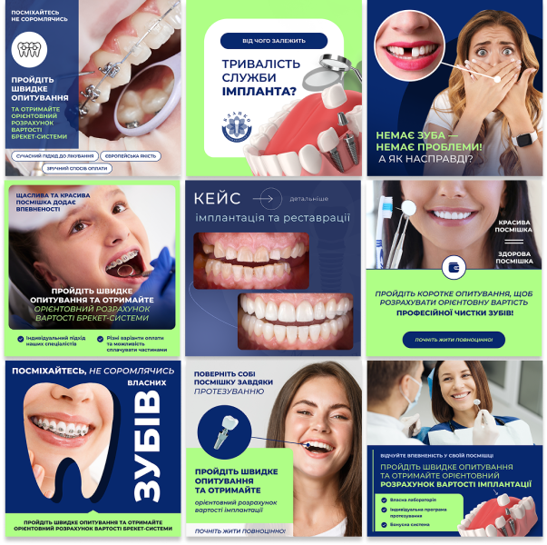 Стоматологічна клініка, що спеціалізується на імплантації та протезуванні зубів. Мета — залучити нових пацієнтів та підвищити довіру до клініки через професійний, інформативний та візуально привабливий контент.